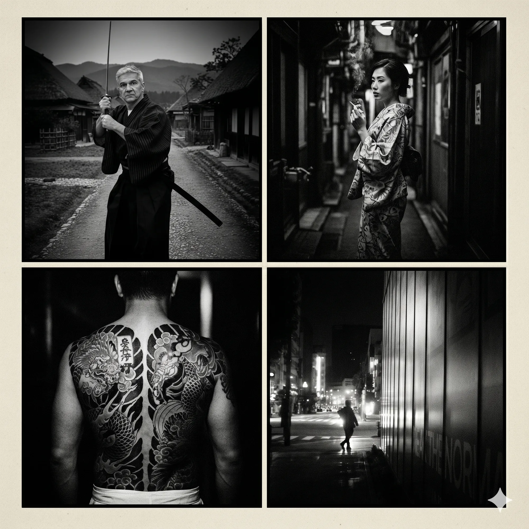 To start:This month, working on AI, and especially on Japan / Kurosawa inspired AI. Using personal photos from my Japan trip as sources, as well as images from my IAIDO club and practice.